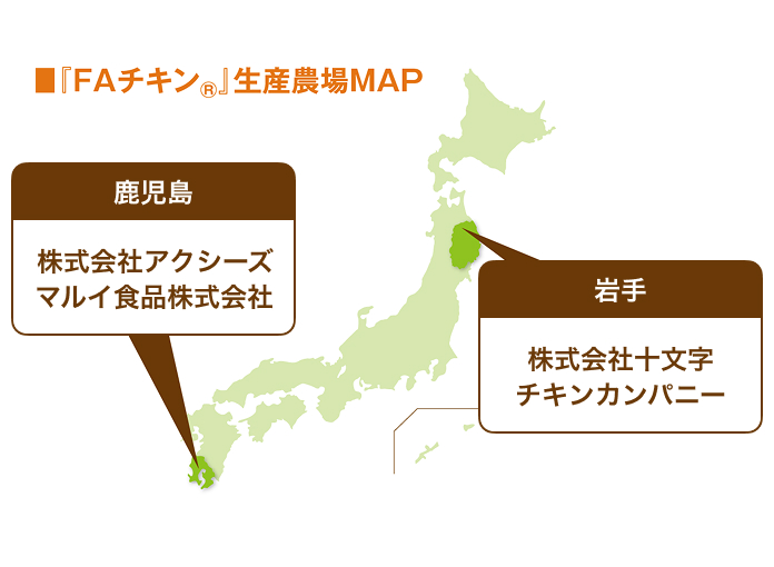 『FAチキン®』は現在、左記の岩手県、鹿児島県の指定農場にて生産しています。また、当社では『FAチキン®』をお客様に継続的に安心してご利用頂けるように、独自の「FA監査」を実施しております。「FA監査」では定期的に産地に赴き、飼料工場から飼育農場・処理工場まで基準に沿った管理が行われているか生産工程の確認、専用飼料や鶏肉製品の残留抗生物質検査を実施しております。