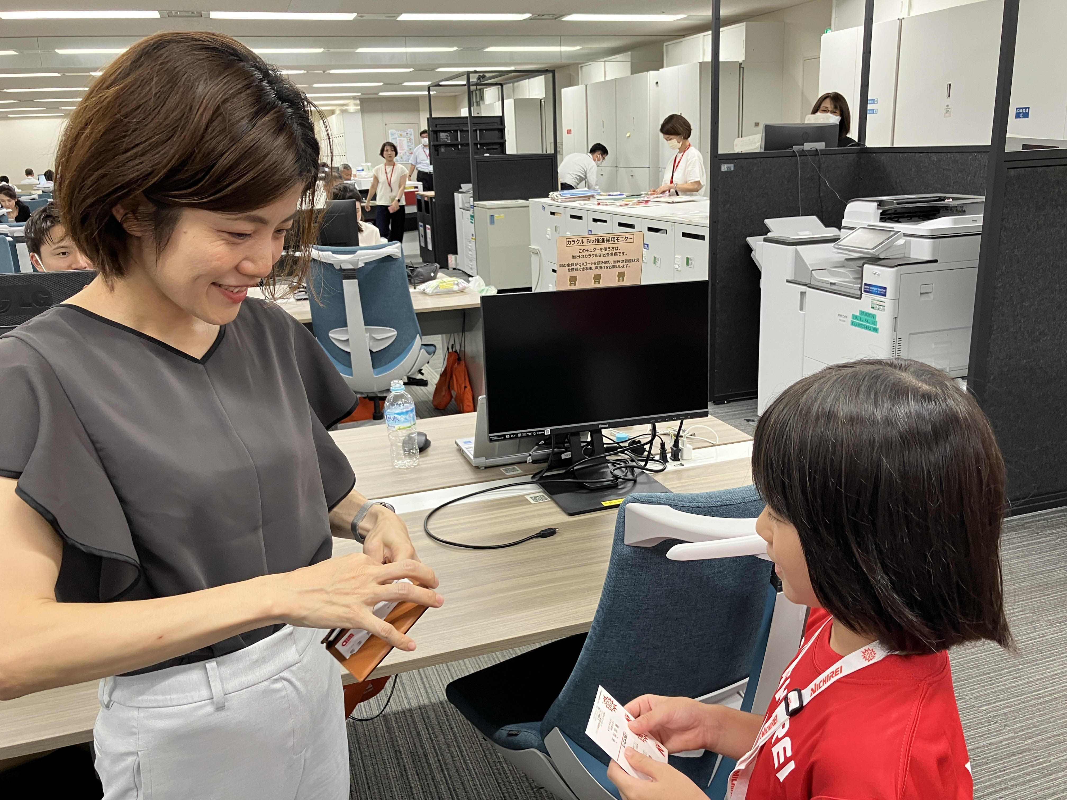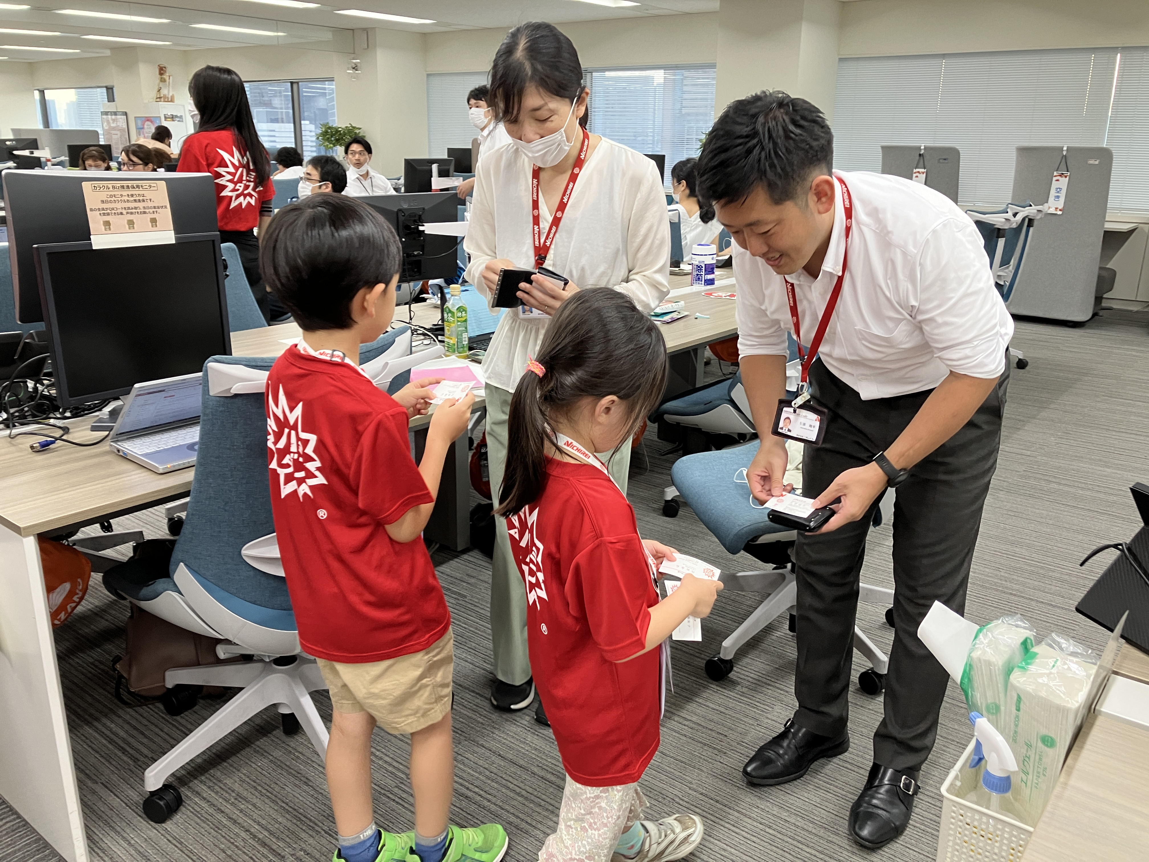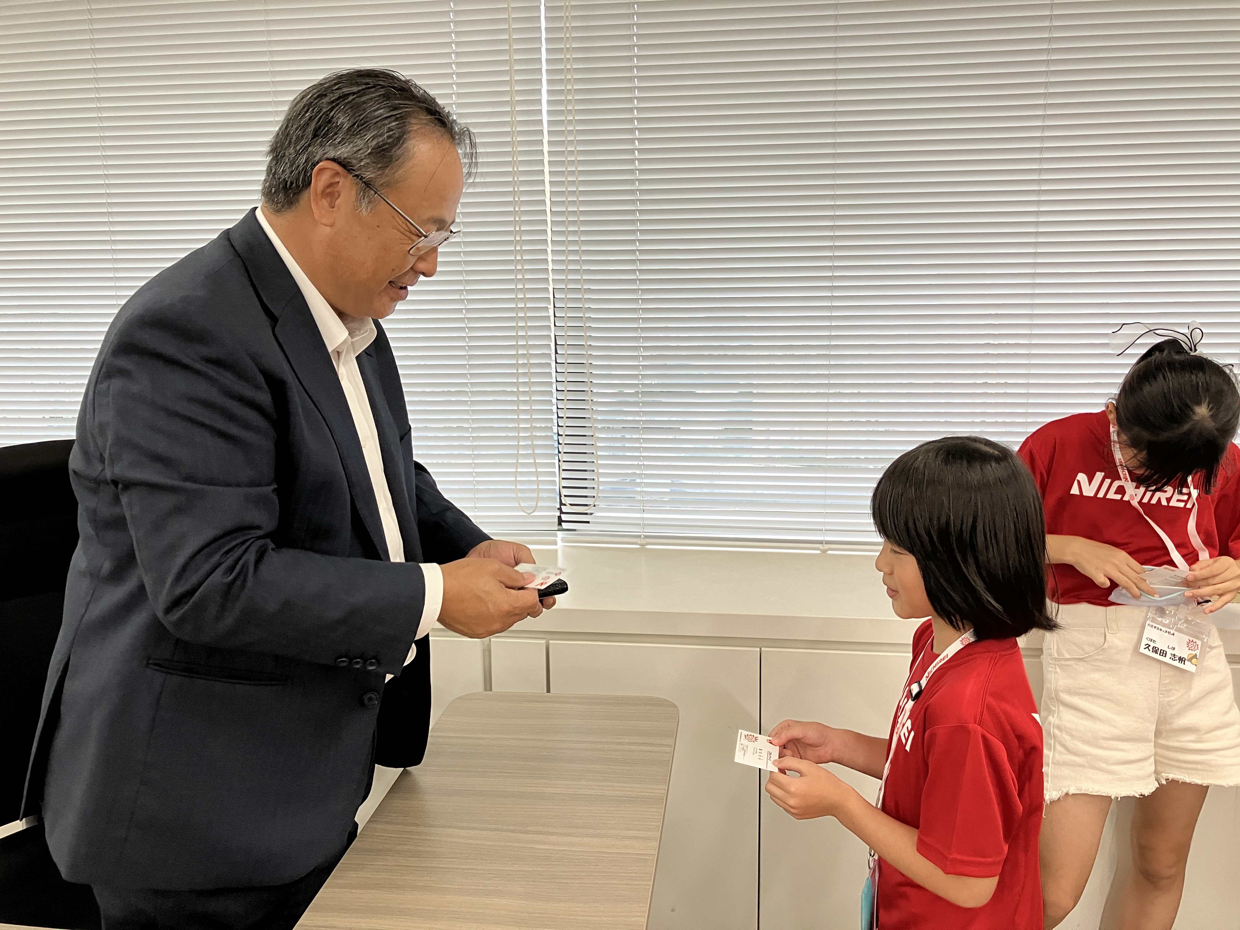 新入社員にように名刺交換を練習して、社長を始め、普段お父さんお母さんがお世話になっている方々と名刺交換を行います。可愛いこども達の名刺交換に癒され、職場が本当に和みます。