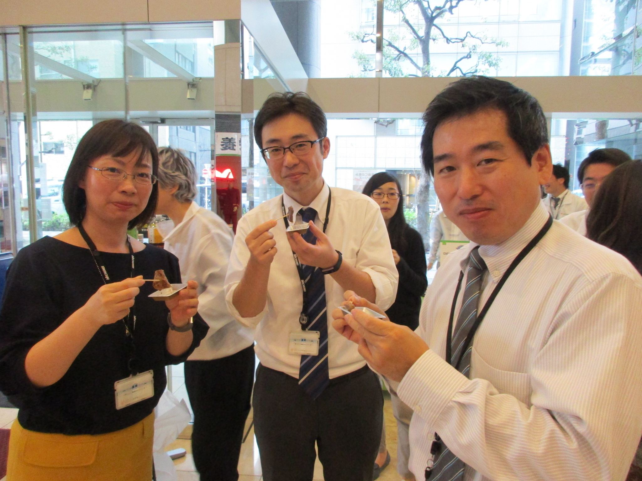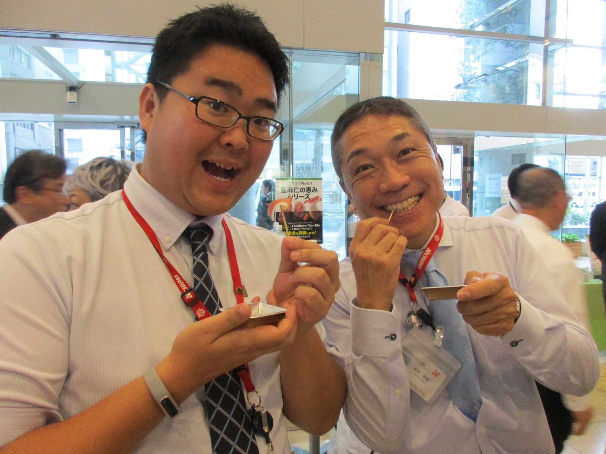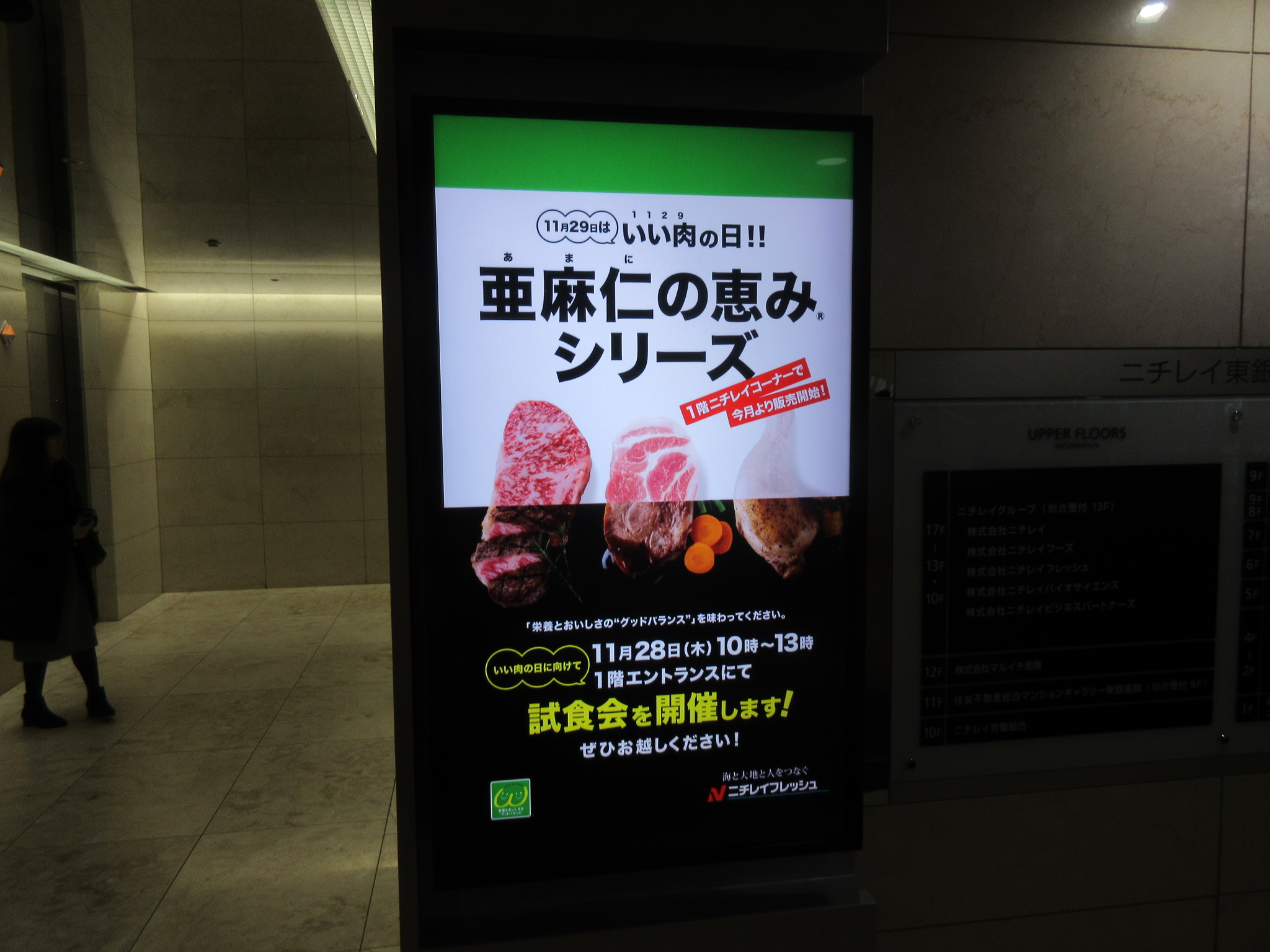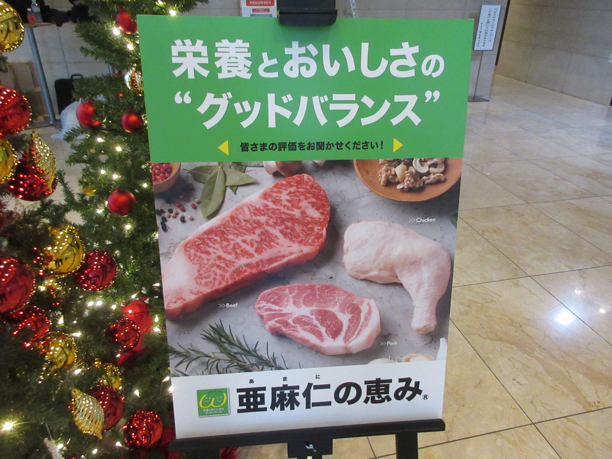 ニチレイフレッシュの商品『亜麻仁の恵み®』の試食会を、ニチレイ本社ビル1階ロビーで開催しました。亜麻仁の牛・豚・鶏の3種類を、従業員だけでなく、本社ビルで働いている他企業のみなさんや来訪された方々にもご試食頂きました。予想を超える方々に来ていただき、大盛況な試食会になりました。