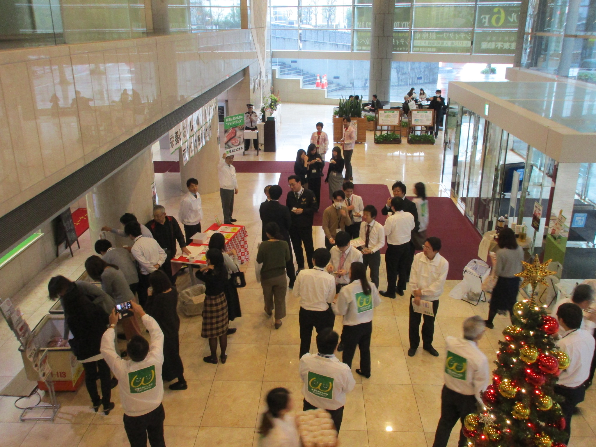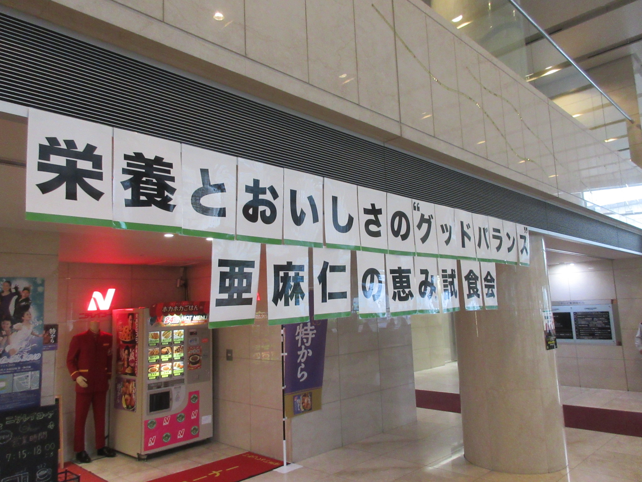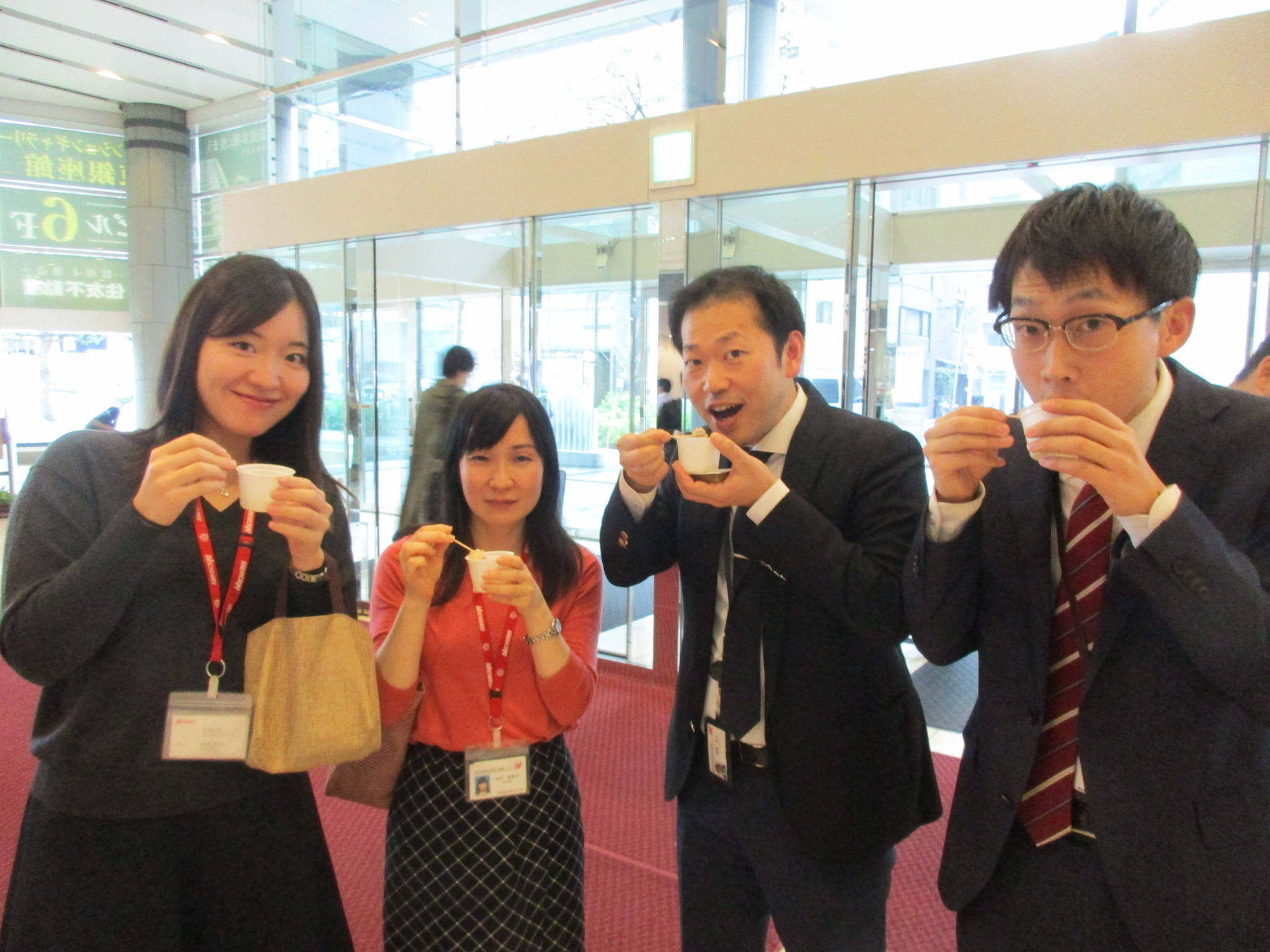 ニチレイフレッシュの商品『亜麻仁の恵み®』の試食会を、ニチレイ本社ビル1階ロビーで開催しました。亜麻仁の牛・豚・鶏の3種類を、従業員だけでなく、本社ビルで働いている他企業のみなさんや来訪された方々にもご試食頂きました。予想を超える方々に来ていただき、大盛況な試食会になりました。