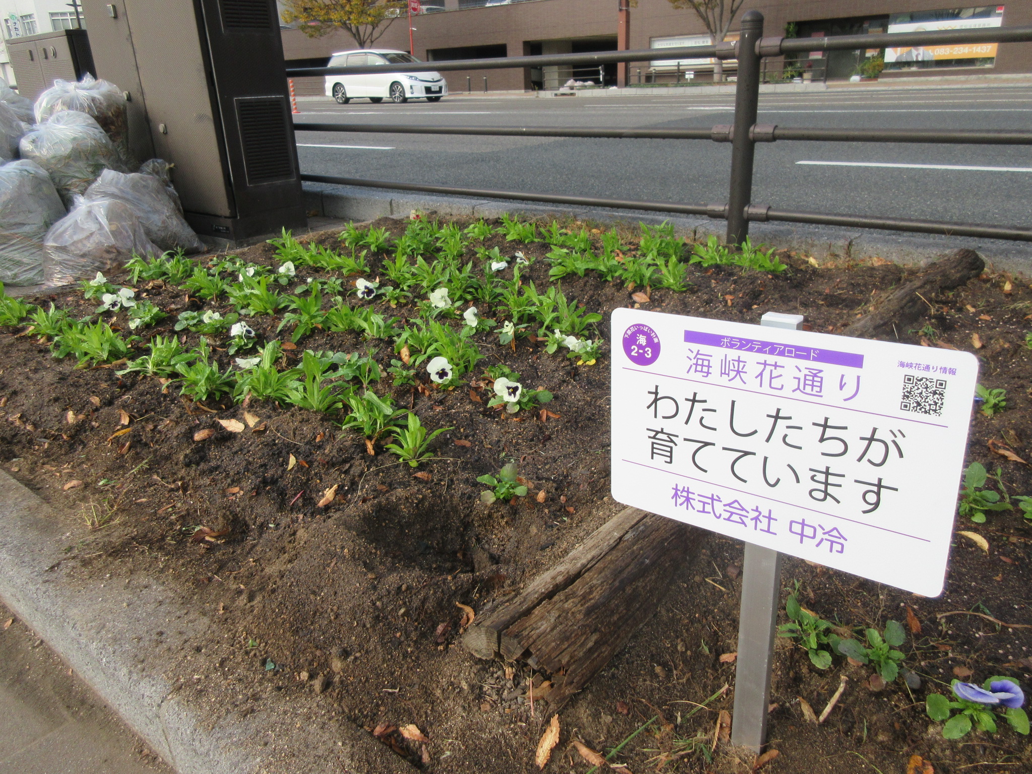 「海峡花通り」として親しまれている、下関の唐戸市場付近の国道9号線沿い。ここでは、80以上の団体や企業など市民により花壇が作られています。春と秋の2回花植えが行われています。