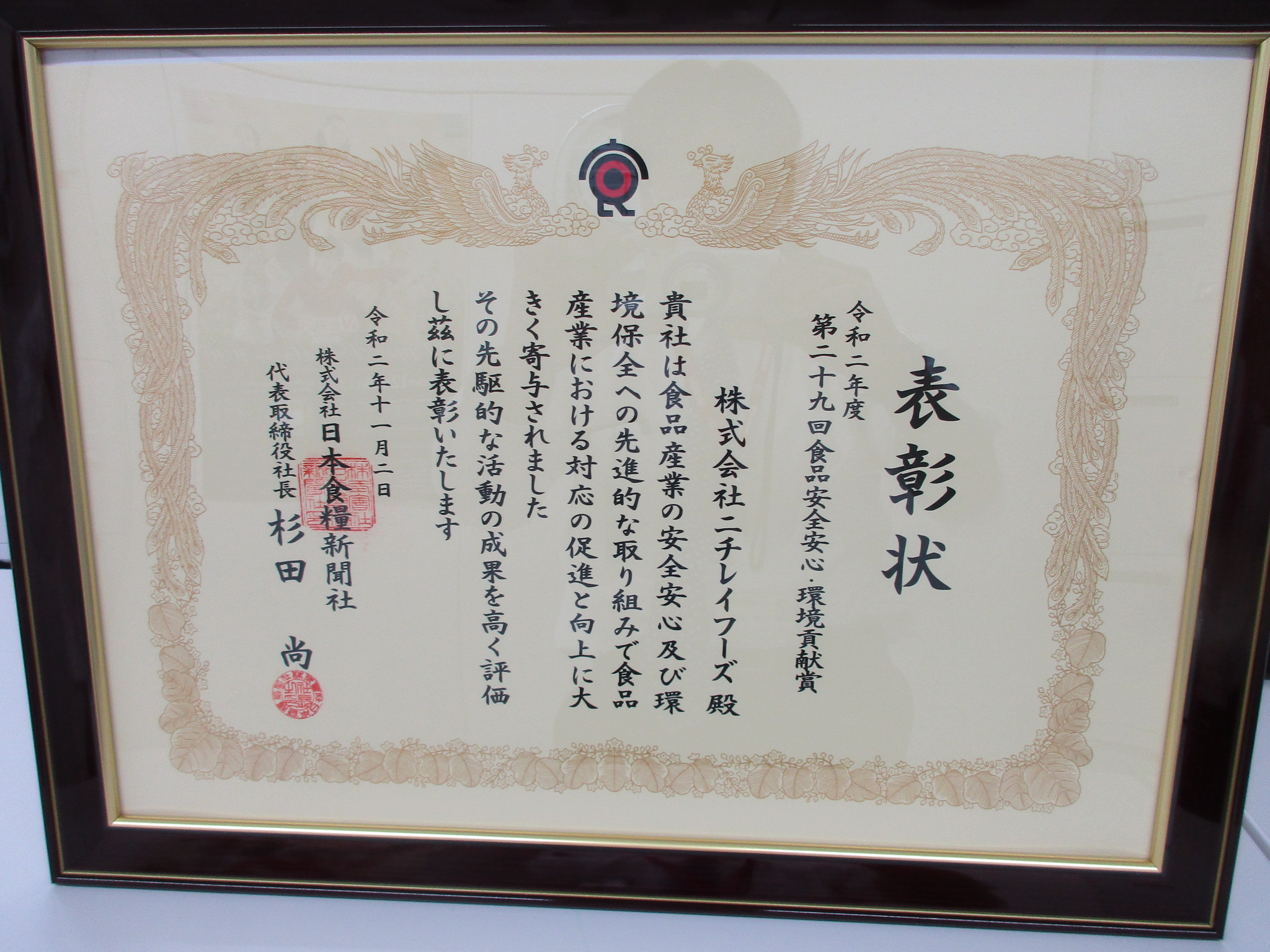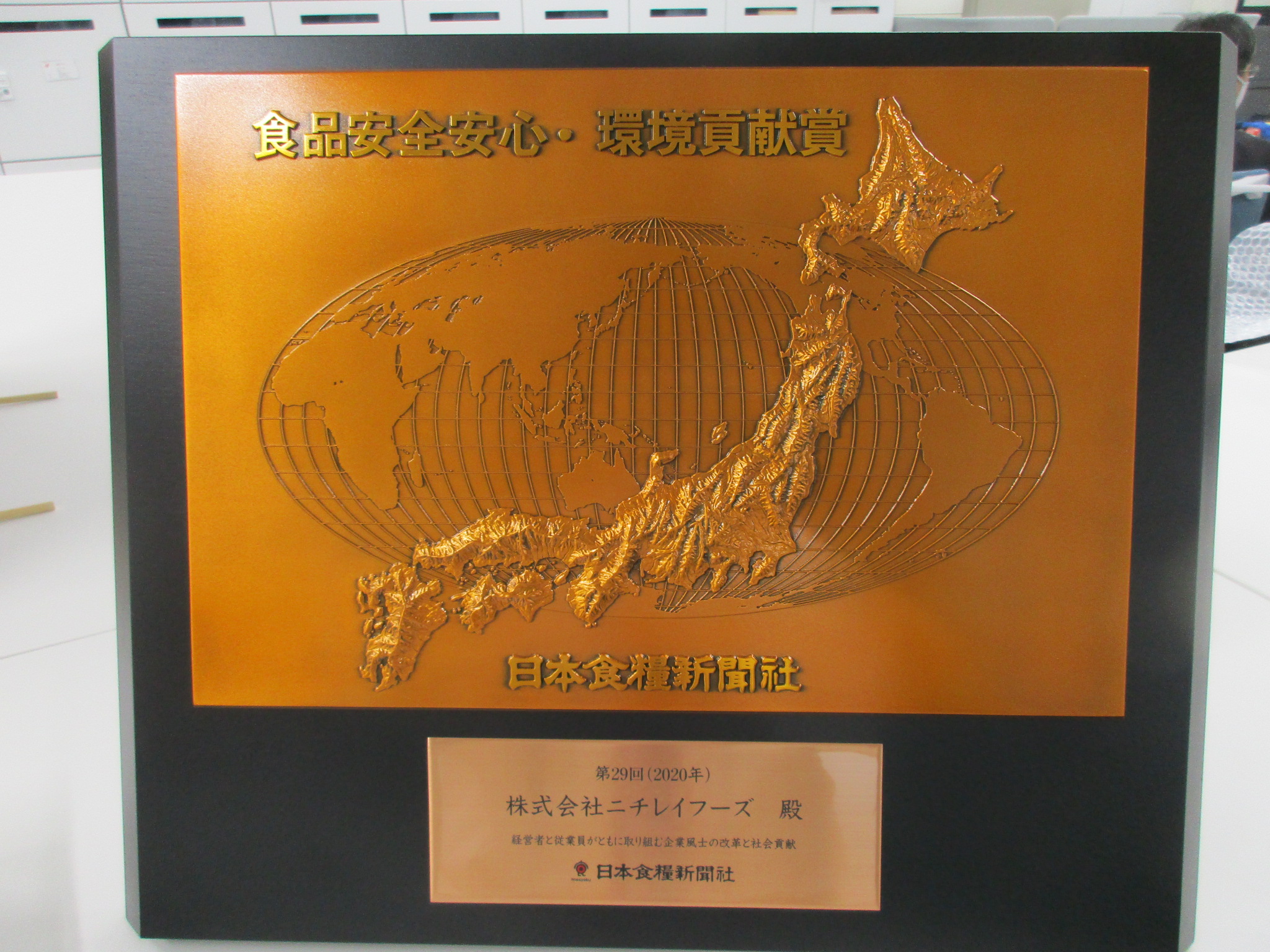 株式会社ニチレイフーズは、第29回「食品安全安心・環境貢献賞」(主催=日本食糧新聞社、後援=農林水産省・環境省)を受賞しました。
