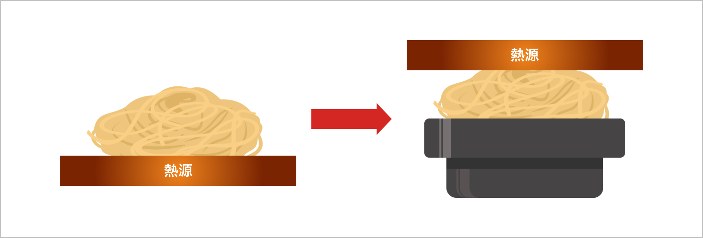 香ばしい麺を提供するためには、しっかりとした加熱、焼目付けが必要となります。香ばしさを追求する上で技術的にボトルネックとなっていたポイントの一つは「加熱すると麺同士がくっついてしまう」点でした。通常の焼き方では、水分やでんぷん質が麺の下の焼面にたまり、強く加熱すればするほど麺が固まってほぐれにくくなります。逆にほぐれやすさを優先すれば加熱が弱まり、香ばしさが出にくくなってしまいます。その両立が難しい中で、開発メンバーが導き出したのが「上面焼き技術」というアプローチです。