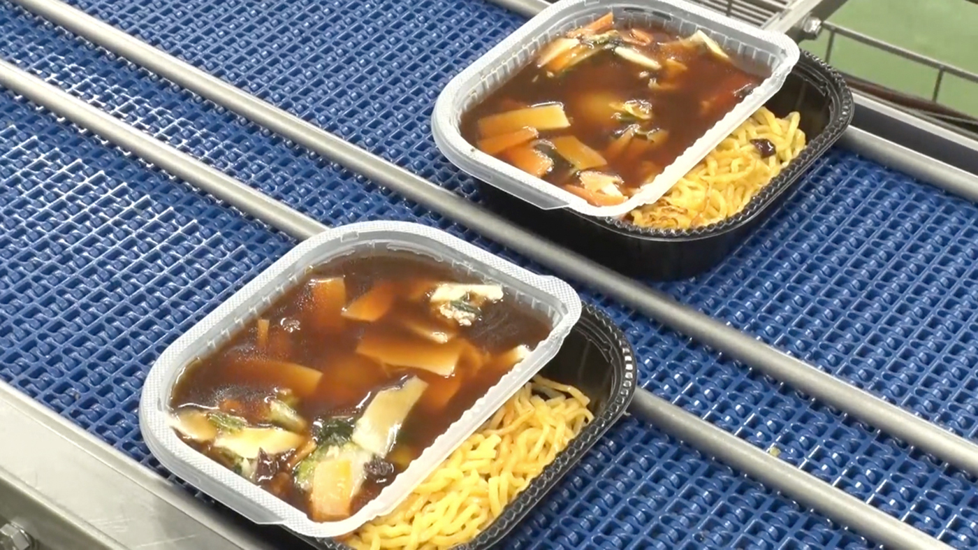 そこで私たちは、お店で提供されるようなシャキシャキとした炒め野菜の食感を目指し、具材とあんを別々に加熱するという新たな調理工程を導入しました。塩分や調味料が野菜に長時間触れると、浸透圧の影響で水分が出てしまうことから、野菜には極力調味料を加えず、最適な順番とタイミングでそれぞれの加熱処理を行う仕組みを構築。この手法を実際の製造ラインで実現すべく、通常なら一つの鍋で調理するところを、あんと具材で二つの調理工程を使い分け、機器もそれぞれ個別に整備。最終的には一つのトレイに収まりますが、その瞬間までそれぞれのおいしさを保つような設計がなされています。