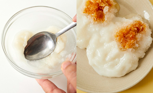 耐熱容器に冷凍餅を1個入れ、水大さじ1を加えて、ラップをせずに500Wの電子レンジで30秒加熱。餅を裏返して、さらに30~40秒加熱して取り出し、スプーンで餅を練ると水分が餅に入って、つきたてのようなやわらかさに。大根おろしを添えて、からみ餅に。