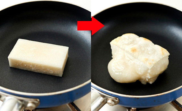 フッ素樹脂加工のフライパンに冷凍餅を置き、中火で5分加熱し、ひっくり返して5分加熱する。餅がふくらんできたらさらに2~3分焼いて、好みの焼き色をつける。