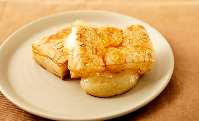 フライパンで焼くと、外側カリッと中はとろっとした食感に! 焼きたてに砂糖じょうゆを絡めてみたらし風に。甘辛味が後を引きます。