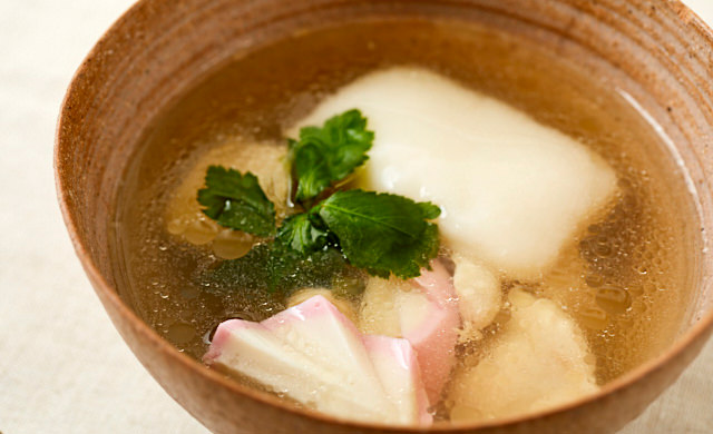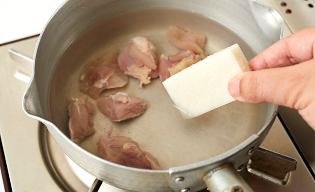 鍋で煮るとトロンとやわらかな食感に。お雑煮なら水(だし汁)、鶏肉、冷凍もちを入れて中火で熱する。鶏肉に火が入り、餅がやわらかくなったら、塩・しょうゆで味をととのえる。かまぼこや三つ葉を添えてでき上がり。