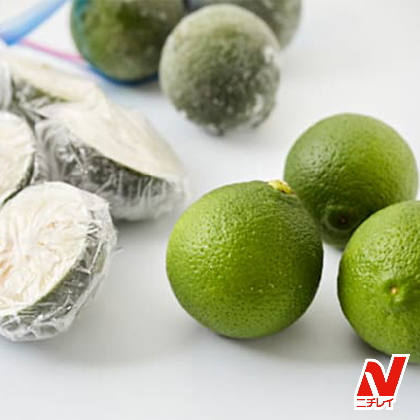 皮をむいた果肉を重ならないようにラップで包み、冷凍用保存袋に入れる。空気を抜いて袋の口を閉じ、冷凍する。1ヵ月程度保存可能。