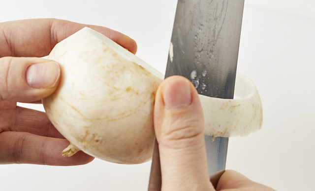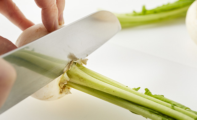 かぶの表面についた氷の粒を洗い流す程度で、すぐに切れる状態になる。完全に解凍すると水分が抜けすぎてしまうので、全解凍する必要はない。