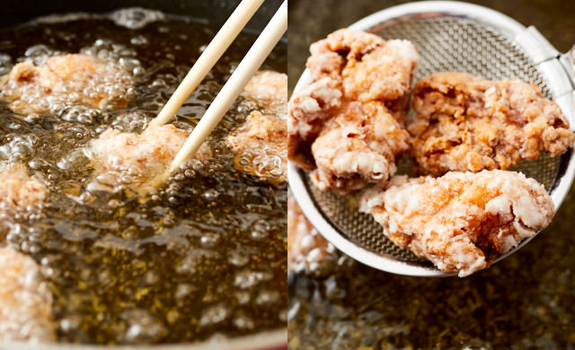 鶏肉がきつね色になったら180℃に温度を上げて、1~3分揚げる。濃いきつね色になり、唐揚げから出る気泡が少なくなってきたら網に上げて油を切る。