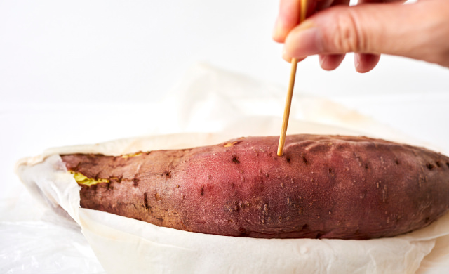 ラップとキッチンペーパーをめくり、太い部分に竹串を刺してスッと通れば完成(さつまいもが熱くなっているのでやけどに注意)。かたさが残っていればキッチンペーパーとラップを元に戻し、竹串が通るまで200Wの電子レンジで30秒ずつ、追加で加熱する。