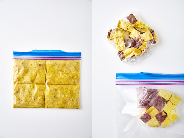 左:マッシュで冷凍する写真、右:角切りで冷凍する写真
