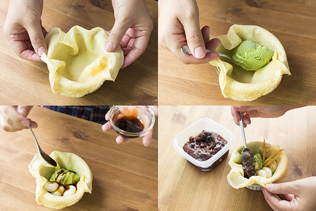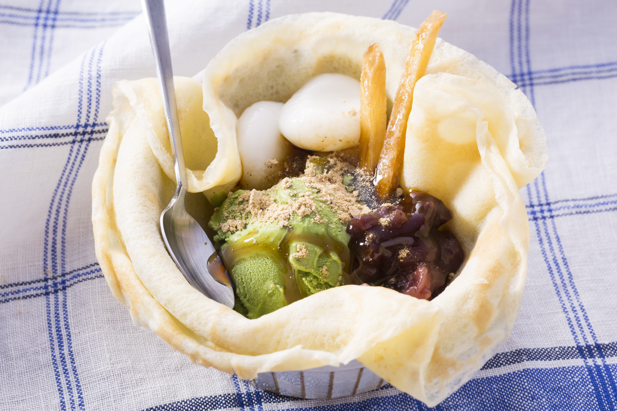- クレープ生地をココットに敷き詰めたら、抹茶アイスクリーム、①の白玉、ゆであずきを入れる。