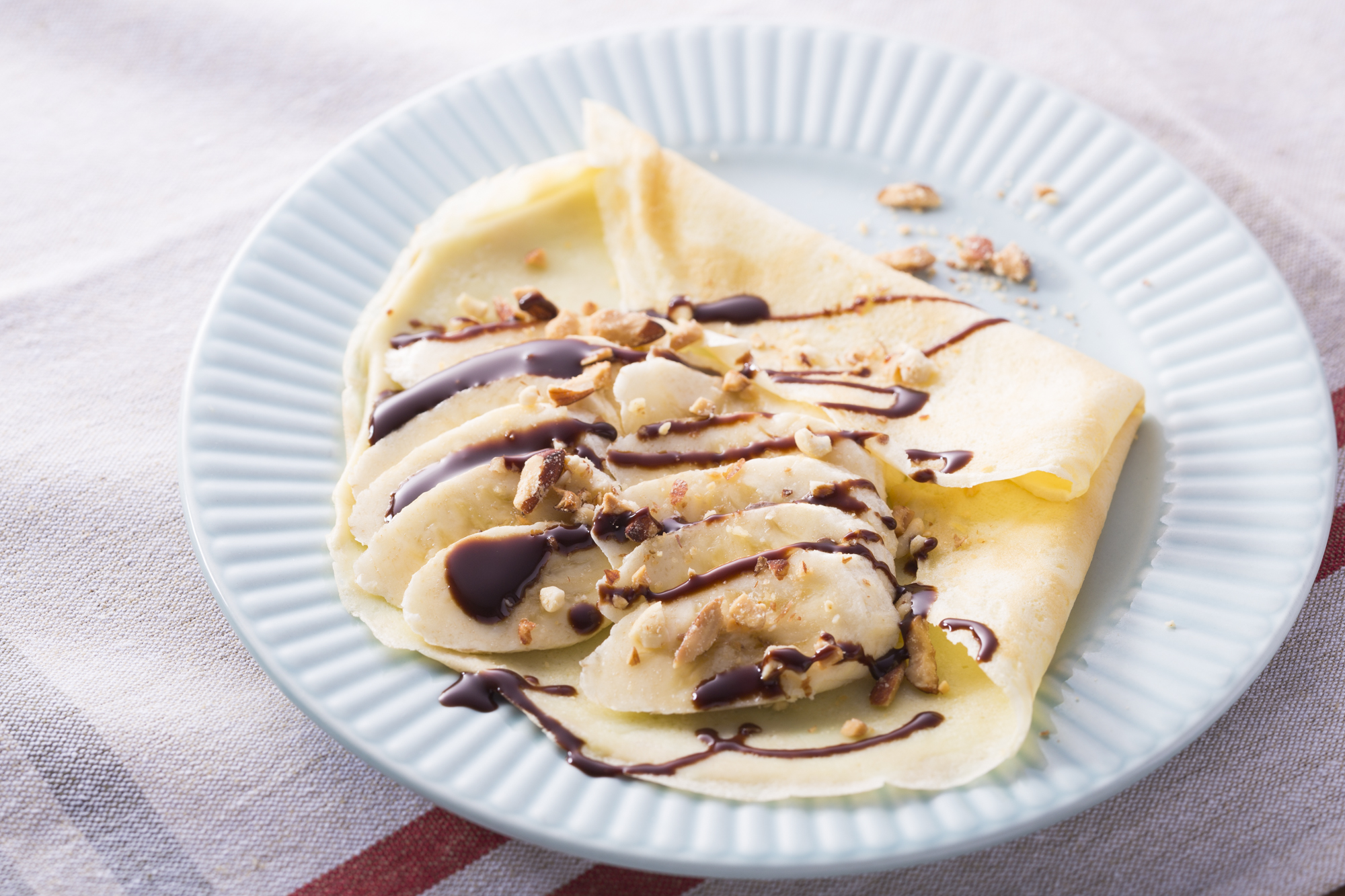 おやつクレープの定番といえば、チョコバナナクレープ。大人にもお子さまにも人気のメニューです。バナナを切ってクレープに乗せてチョコレートソースをかけるだけなので、小さなお子さまでも楽しく作れますよ。