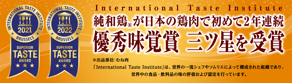 株式会社ニチレイフレッシュ(代表取締役社長:田邉 弥)が、養鶏・販売している「純和鶏®」(じゅんわけい)が、ベルギーで開催された International Taste Institute (国際味覚審査機構、以下ITI)2021年秋の審査会において、最高位の優秀味覚賞「三ツ星」(※出品部位:むね肉)を受賞しました。なお、純和鶏®は昨年も受賞しており、日本の鶏肉で本審査において2年連続「三ツ星」を受賞したのは初めてのことです。