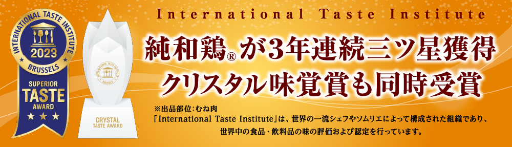International Taste Institute (国際味覚審査機構、以下ITI)2023年の審査会において、最高位の優秀味覚賞「三ツ星」(※出品部位:むね肉)を受賞しました。また、この度の受賞で3年連続「三ツ星」の受賞となり、プレステージ賞としてクリスタル味覚賞を同時受賞しました。