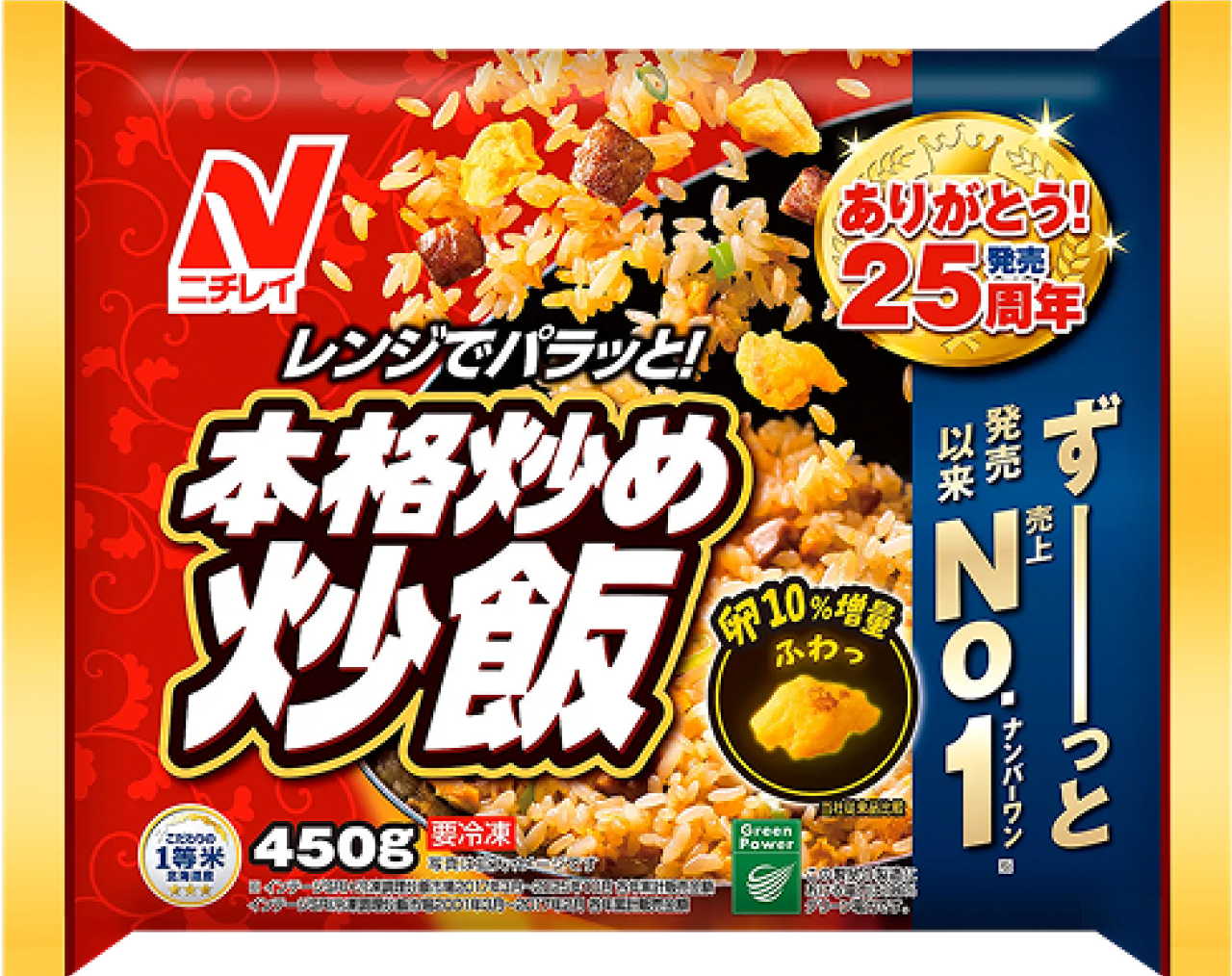 2001年の発売以来、25年連続売上No.1(※)を記録する“日本一売れている”冷凍炒飯です。プロの料理人の調理工程を研究し再現した「三段階炒め製法・改」を採用し、特許製法である250℃以上の高温熱風での調理を行うなど、家庭では手作りできない圧倒的な「炒め」パワーで、ごはん一粒一粒に卵をまとわせることで、電子レンジでパラパラ感と香ばしい風味を実現しました。