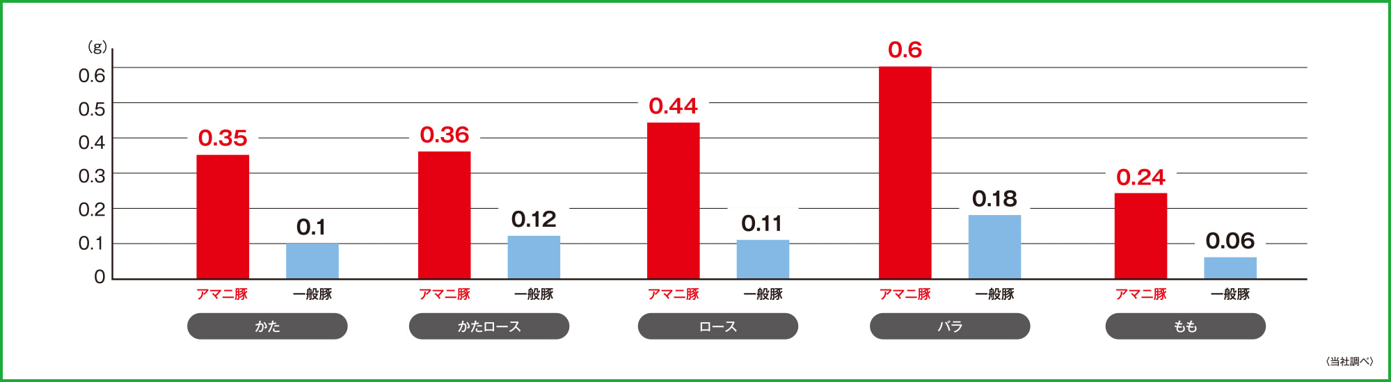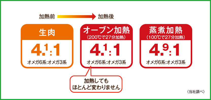 当社による調査では、豚肉でも鶏肉でもさまざまな部位においてオメガ3系脂肪酸が多く含まれていることがわかりました。また「オメガバランス」においても、理想的な比率に近い数値が見て取れます。