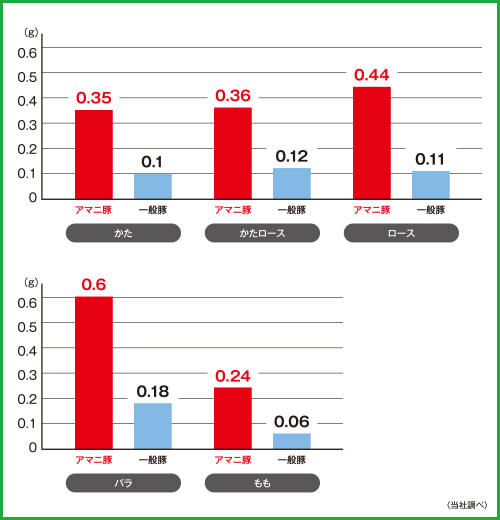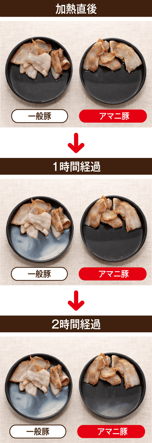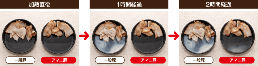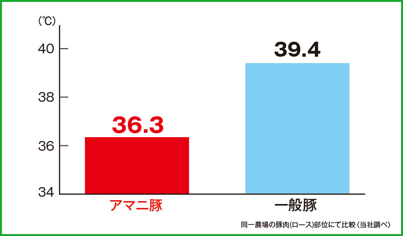 「アマニ豚」の脂肪は、一般的な豚肉に比べ約3℃ほど融点が低く、口どけがなめらかです。豚肉の場合、“オメガ3系脂肪酸”が一般の豚肉に比べて多く含まれているため、脂肪の口どけがまろやかで、加熱後時間が経過しても脂が固まりにくく、さらさらした状態が続きます。