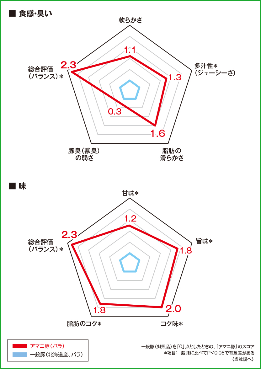 「亜麻仁の恵み®」は、当社が実施した官能評価において、脂の口どけの良さだけでなく、肉質のやわらかさ、旨味、コク味などでも良い評価をいただいています。