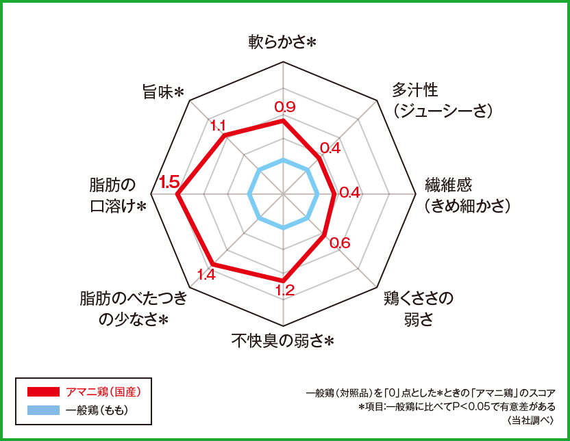 後味がさっぱりしていることで評価をいただいているほか、脂肪のなめらかさ(口どけ)・旨味の面でも高評価なので、結果として総合的なバランスの良さを示しています。
