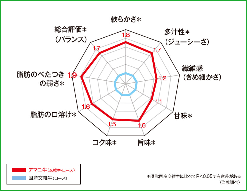 肉質の柔らかさ、脂肪のなめらかさ(口どけの良さ)で高いスコアを示しています。また旨味やコク味などの味に加え、ジューシーさを示す多汁性でも評価をいただいております。