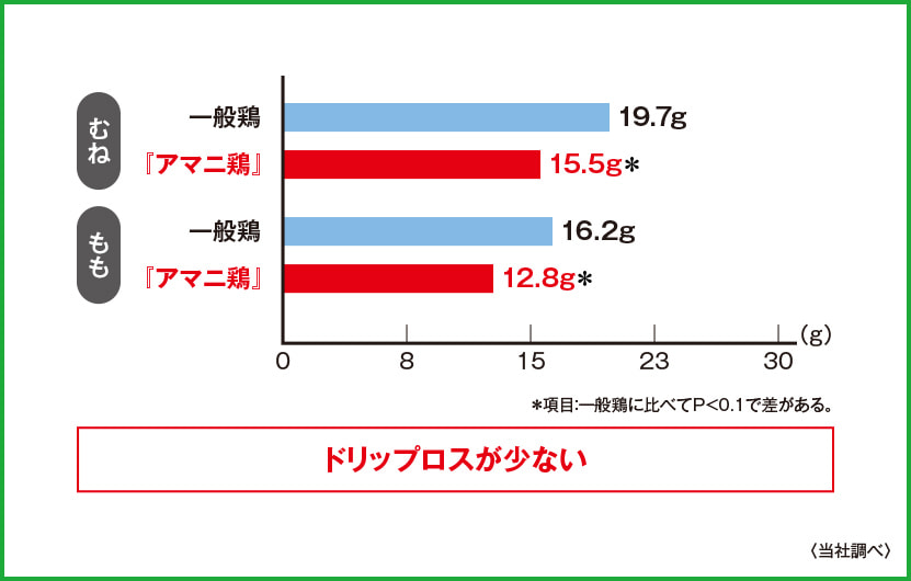 「アマニ鶏」は、ドリップロス(ドリップの損失)が少ないので、品質が保たれやすくなります。