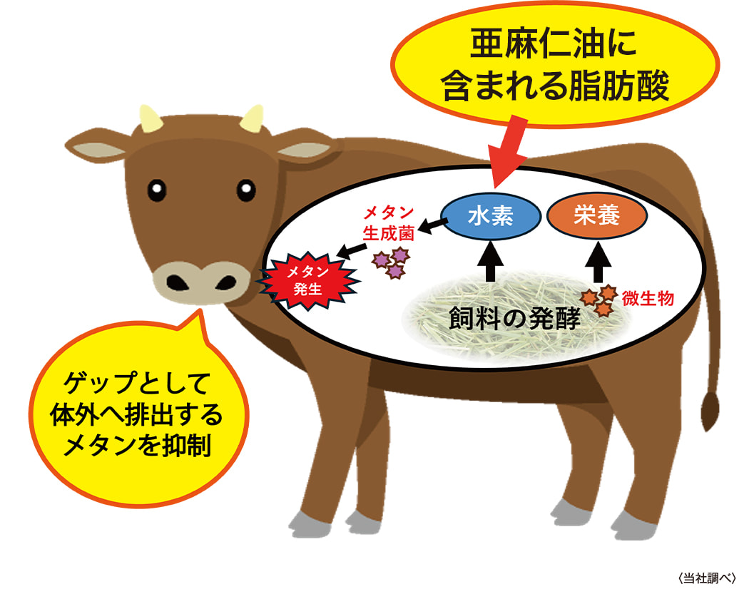 亜麻仁油に豊富に含まれる脂肪酸は、メタンガスの基質となる水素を消費し、メタン生成菌の活動を抑えることで牛の消化管で発生するメタンガスの発生を減らすことが報告されています。当社は、この亜麻仁油由来の成分を飼料として配合し、環境に配慮した牛の肥育方法として研究機関と共同で開発に取り組んでいます。