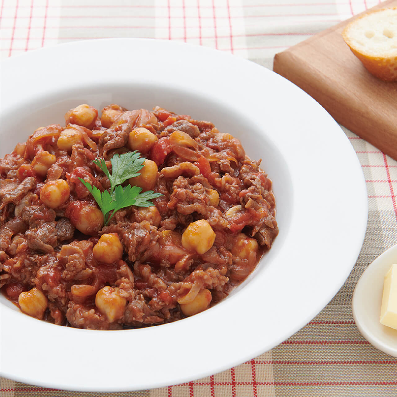 ③ ひよこ豆、トマト缶、砂糖を入れ、蓋をし弱火で煮る。