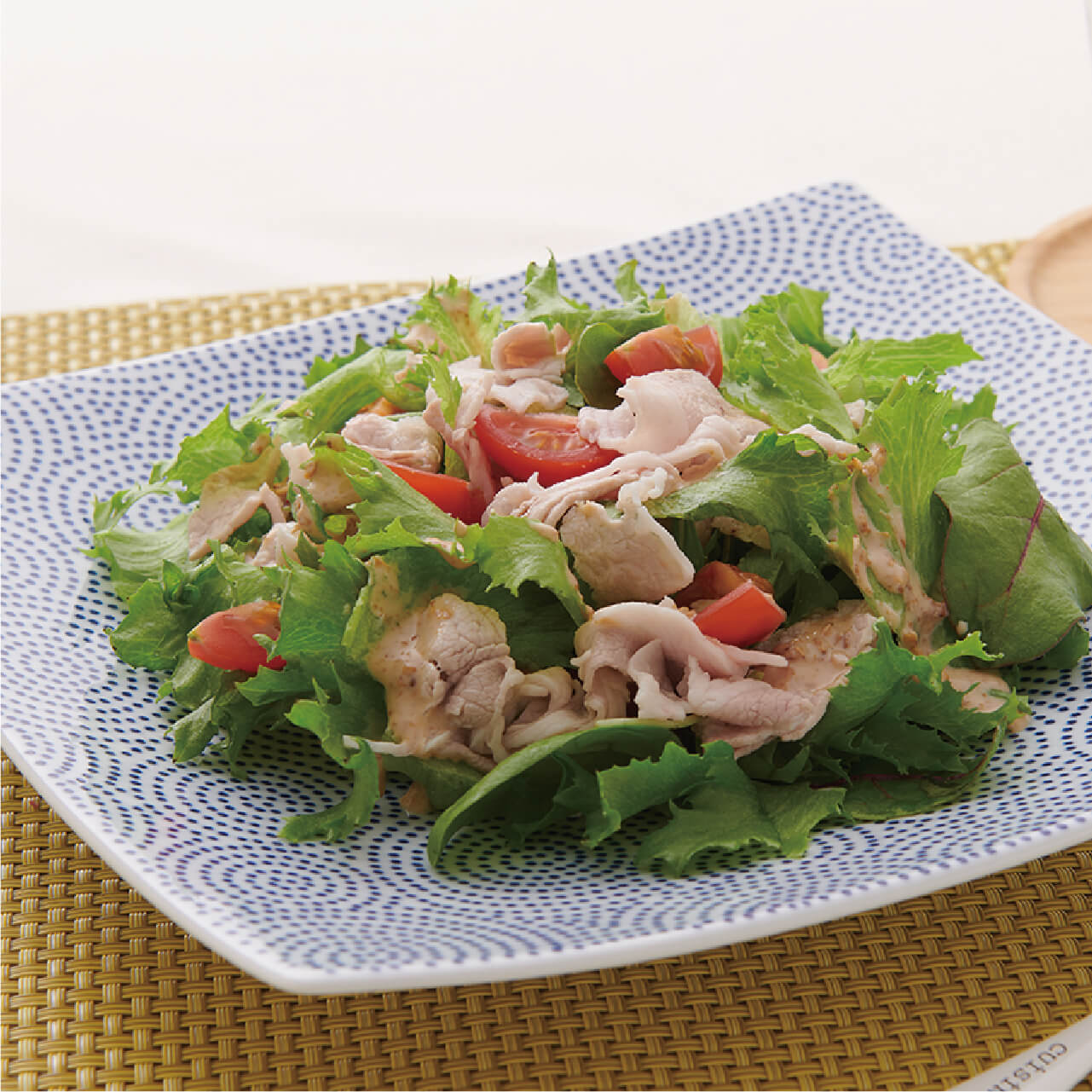 ② ボウルにフリルレタス、ベビーリーフ、豚肉、トマトを器に盛り、ごまドレッシングをかける。