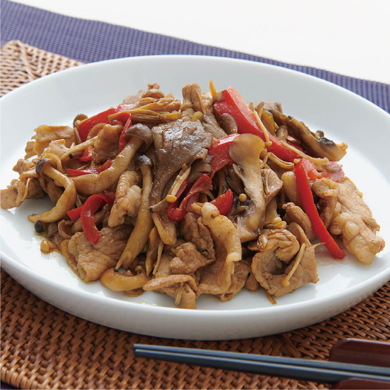 ① フライパンに油を入れ熱し、にんにく、豚肉、きのこ、パプリカを炒める。