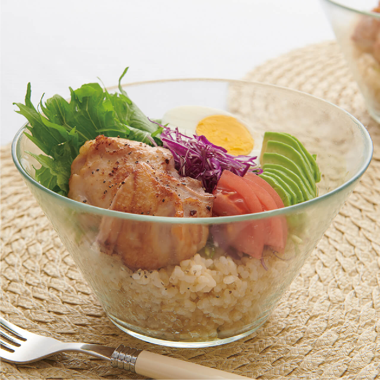 ② 器に玄米を盛り、葉野菜、鶏肉、卵、紫キャベツ、アボカド、トマトをのせドレッシングをかける。