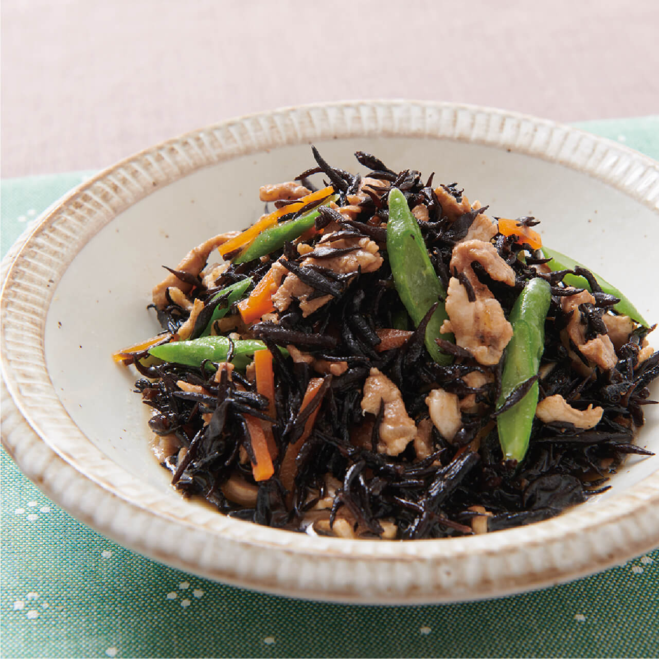 ① 鍋にごま油を入れ熱し、豚肉、ひじき、にんじんを入れ炒める。