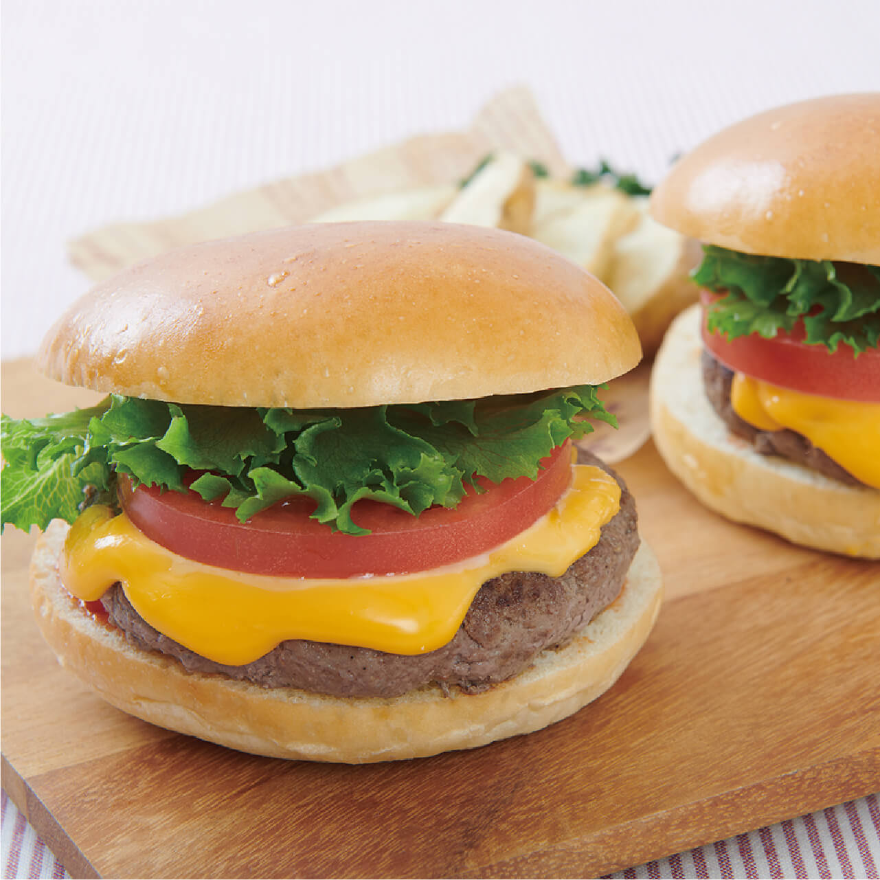 ⑤ バンズ、肉、トマト、レタス、バンズの順に重ねる。