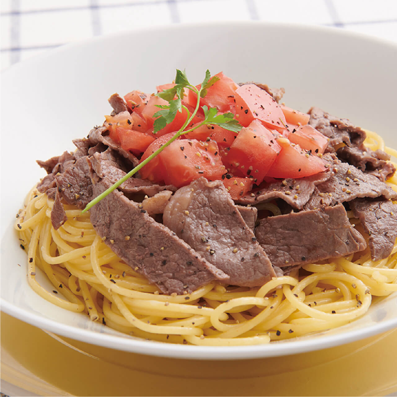 ④ パスタを器に盛り、牛肉、トマトをのせる。