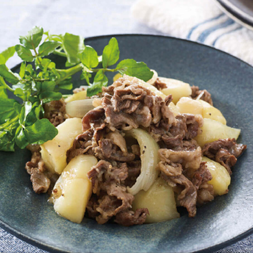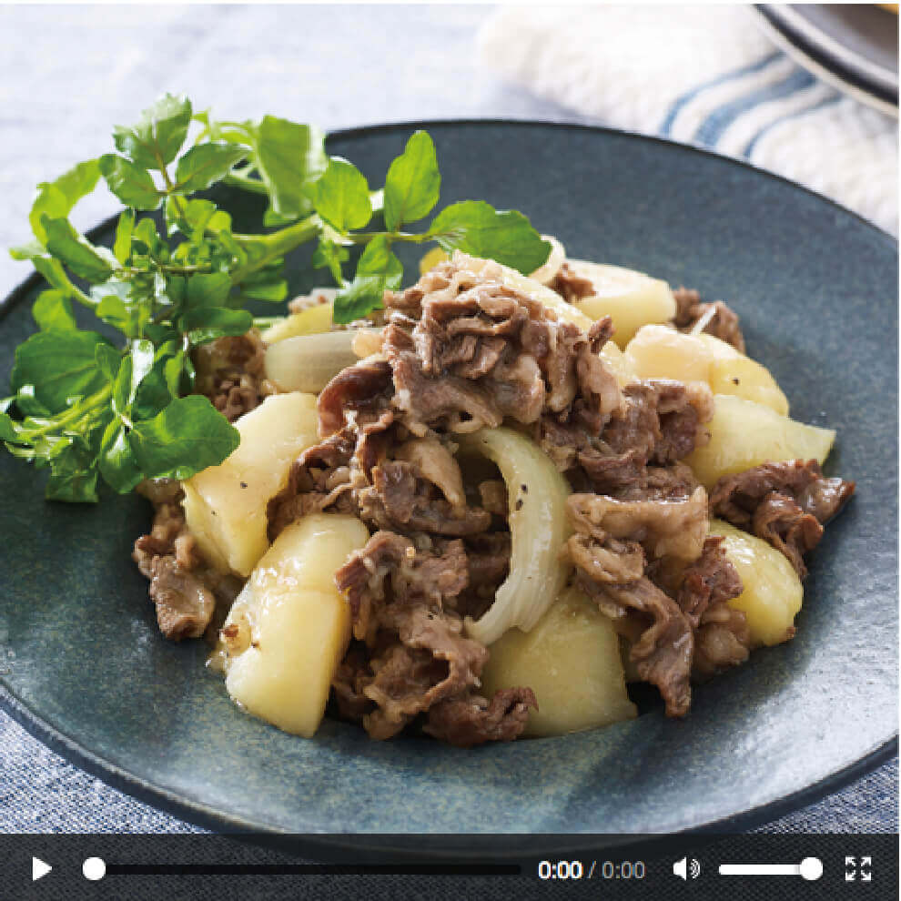 ① 牛肉は食べやすい大きさに、じゃがいもは皮をむいて1個を8等分に切り、水にさらしておく。