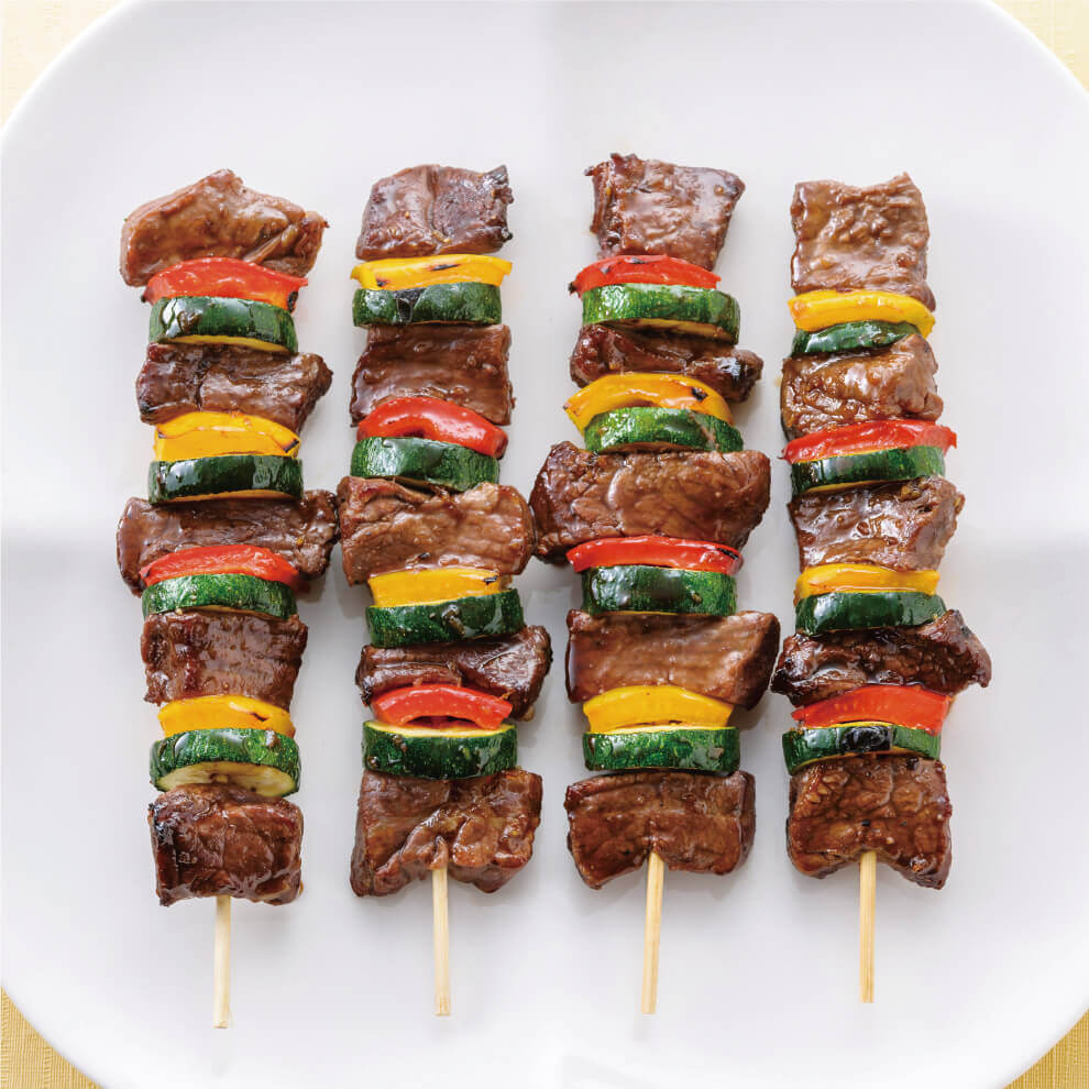 ② ①の材料を交互に串に刺す。(初めと終わりを肉にし、隙間なく刺す)