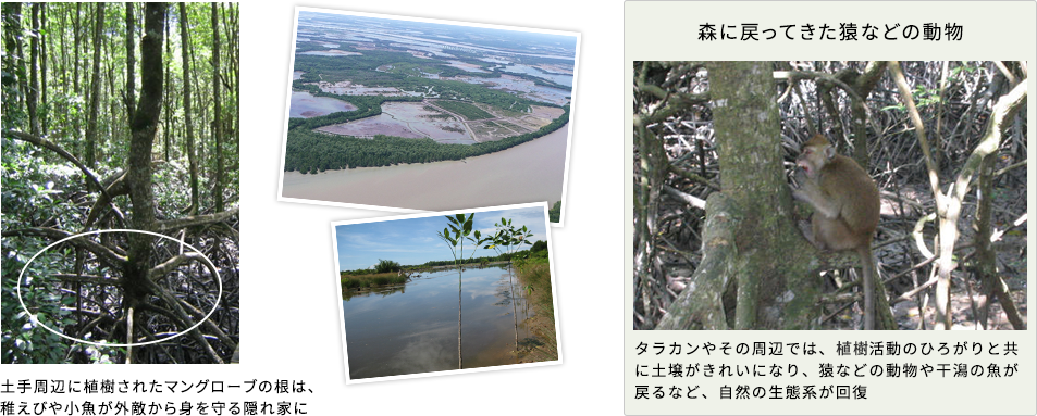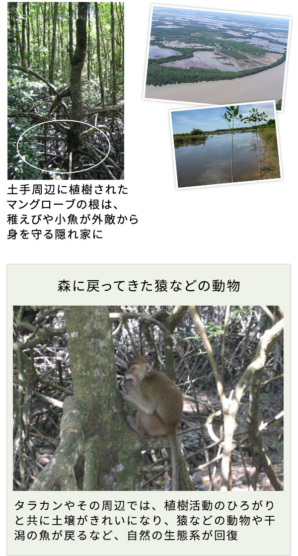 廃棄された池や池の周りのマングローブの植樹を進める事で、廃棄された池は再生されて自然に戻り、池の周りの植樹は土壌侵食を防ぐことが出来ます。