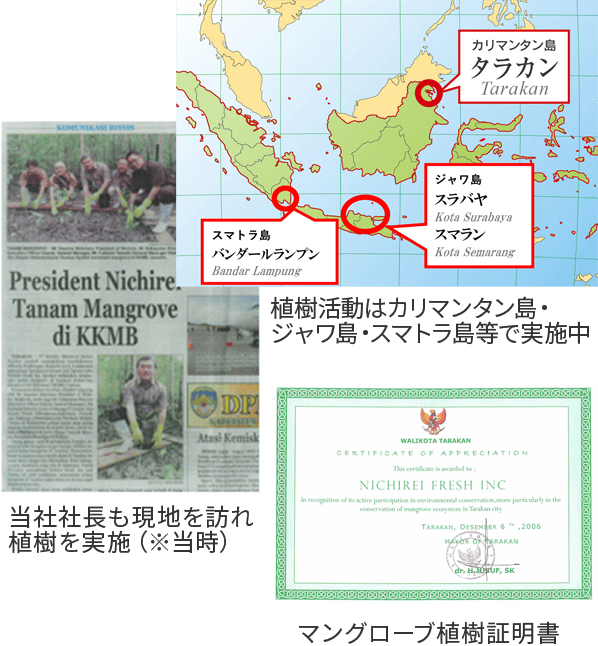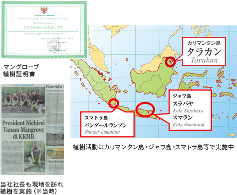 ニチレイフーズは2006年12月から地元企業MMA社への支援を通じてマングローブの植樹活動をスタートいたしました。