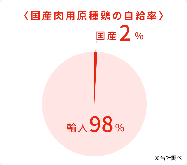 仮に、種鶏や原種鶏の調達先である国々で鳥インフルエンザなどが発生し、一時的にでも輸入が停止した場合、日本の鶏肉生産は大きな影響を受けるリスクがあります。「国産」は「食」の安全・安心のイメージが高まっていますが、「国産」志向は食料安全保障のキーワードでもあるのです。