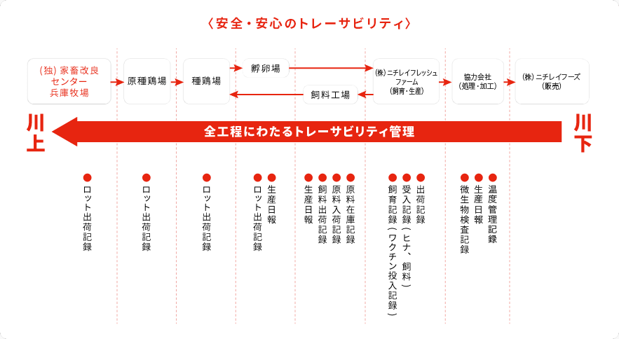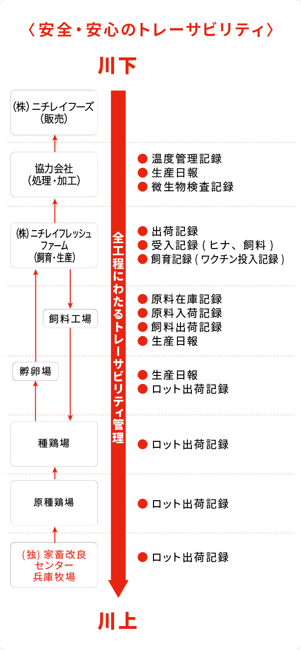 『純和鶏®』は、兵庫牧場が保有する“確かな系統”の育種改良で生まれた肉用鶏です。 従って、卵から雛のトレースはもちろんのこと、そのルーツである基礎鶏までロット単位で履歴を遡ることができ、トレーサビリティは万全です。